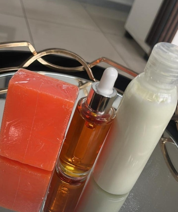 Get two shades lighter with Kojic soap, radiant serum and radiant lotion.
